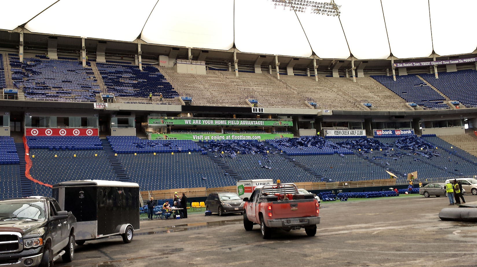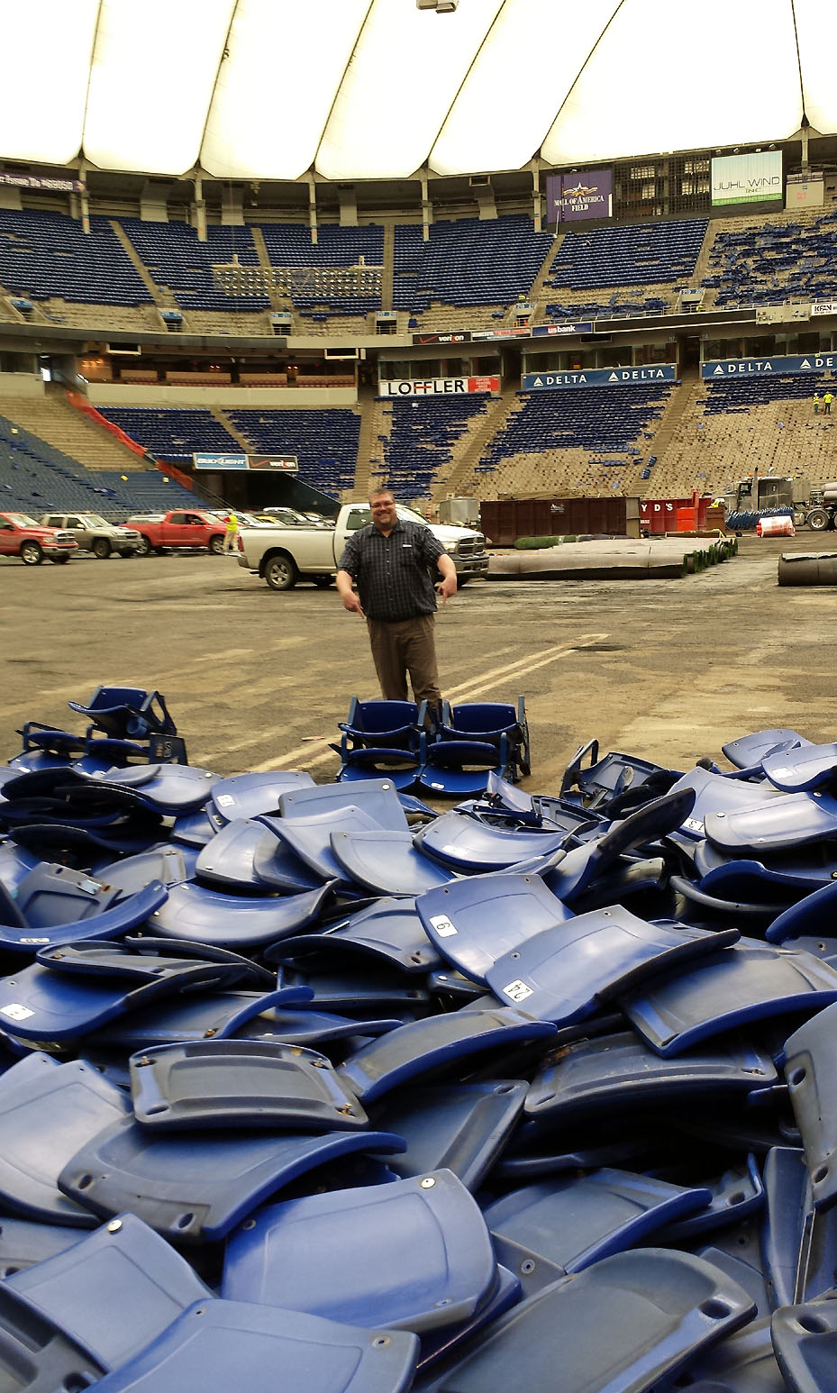 When the Twins moved to Target Field for the 2010 season, I knew I wanted those two seats when the Metrodome was demolished (Pic 1, Pic 2, Pic 3). Those seats represented much more to me than a couple ugly seats. They held all the good times (and a couple tough ones mainly in the post season) I had for a number of years before I moved “next door” sharing a pair of seats with Heidi & Bob. When I heard the process that was going to happen when the seats were to be sold, I immediately sent in my request for seats 1, 7, 8, and the highest number in the row. What I wanted to do was to replace the two outside sides of the seats with the aisle marker with the Metrodome logo and the row marker. I received a call a week after they went on sale that I could get my 7 & 8 seats but 1 was spoken for already. I did not care. I was getting 7 & 8 and could get the left and right aisle sides from any row 20. I was pumped. I waited for the word to go pick them up. The word never came. I spoke with my buddy Joel and he said we should drive down there today because it was the last day to pick up the seats and if I did not get them then, I probably would not get the seats I wanted. At 9:30 this morning I headed to Minneapolis to meet up with Joel. I got in the car line and it was not moving. Luckily Joel brought a dolly and we parked on the street and brought the dolly in. This was Joel’s second time picking up seat stuff so he knew who to talk to. We immediately found Tony. Tony was the foreman of the job I am guessing. I told him what seats I was after and they had yet to pull any seats from 120. I was in luck! Tony immediately drove the cart to that section and pulled those seats for me and had a gentleman walk them over to me… all the way from 120 to where we were standing in left field! I tipped that person $20 as a token of thanks. Tony asked about seat 1 and the other aisle seat. I told him I did not care which section they were from as long as they had a 20 and an M logo on the side. He found the two seats and brought them to me. I tipped him too. When all four seats were there, I told Tony what those meant to me. He was genuinely happy to help me get what I wanted. So, Tony, I know you won’t ever see this but THANK YOU!