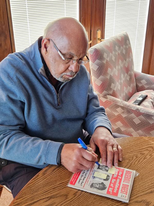 I recently received my February, 1968 Baseball Digest back from Rick Reichardt and was hoping to find a Billy Williams signing event soon. Turns out I did not have to wait long! Jim & Steve’s Sportscards in Chicago announced Williams was going to be a guest of theirs at a signing event. I sent in my magazine and received it back today! They even sent me a picture of Billy signing my magazine!