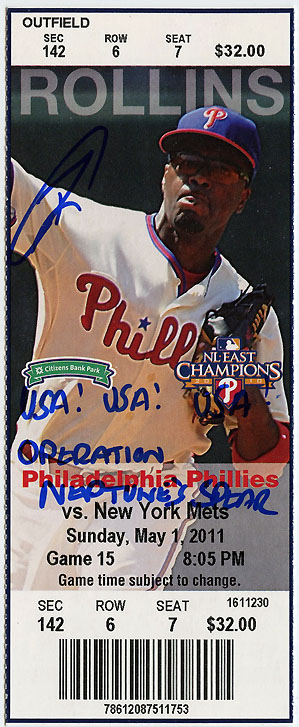 I sent in my ticket and asked for a couple inscriptions. I got “USA! USA! USA!” and “Operation Neptune’s Spear” along with his signature. It is one of the most expensive autographs I ever paid for but it is one of the coolest. The ticket goes perfectly with my 9/11/2002 game used hat that Doug Mientkiewicz wore for the one year anniversary of that fateful day. Doug had written a couple items on the hat and I was able to get it signed the following season at the 2003 Twins Autograph Party. I am very excited to add this to my collection!